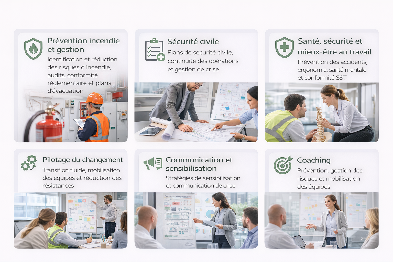 Accompagner les organisations dans la prévention, l’analyse et la maîtrise des risques en offrant des services professionnels en prévention incendie, sécurité civile, santé et sécurité au travail, pilotage du changement, communication et coaching, afin d’assurer la conformité, la sécurité et la résilience organisationnelle.